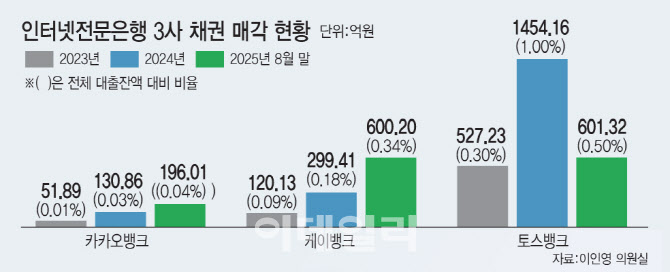은행별로 보면 토스뱅크가 가장 눈에 띈다. 토스뱅크는 2024년 한 해에만 1454억원을 매각하며 전체 대출의 1.0% 수준을 기록했다. 케이뱅크도 같은 해 299억원을 매각한 데 이어 올해 들어 8월까지 600억원을 넘겼다. 카카오뱅크는 상대적으로 적은 규모로 올해 8월까지 196억원만 매각했다.