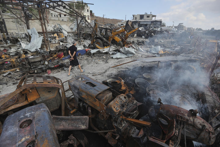 [안사리예=AP/뉴시스]9월 4일 레바논 남부 안사리예 마을에서 한 주민이 전날 밤 이스라엘의 공습으로 파괴된 불도저들 잔해를 살펴보고 있다. 이스라엘군은 17일에도 동부 발벡 시내를 공습해 헤즈볼라 등 2명을 살해했다고 레바논국영 NNA통신이 보도했다. 2025.09.18. |