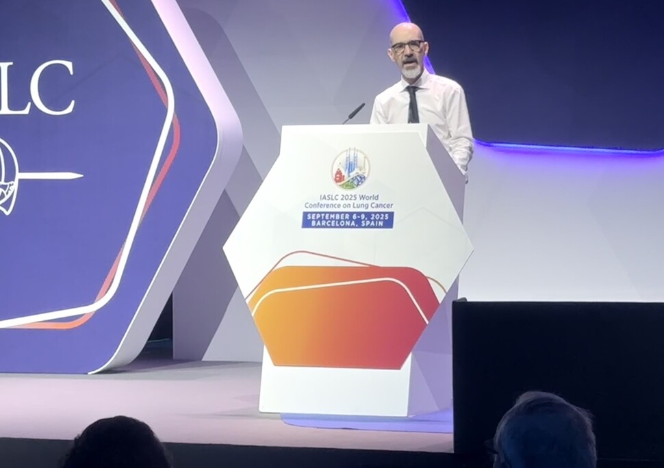 7일(현지시각) 스페인 바르셀로나에서 열린 ‘세계폐암학회 연례학술회의’(WCLC25) 2일차 기조강연에서 플라우라2 3상 임상연구의 최종 전체생존기간(OS) 중앙값을 발표 중인 다비드 플랑샤르 프랑스 귀스타브 루시 연구소 흉부종양내과 교수. 바르셀로나/최지현 기자 jhchoi@hani.co.kr |