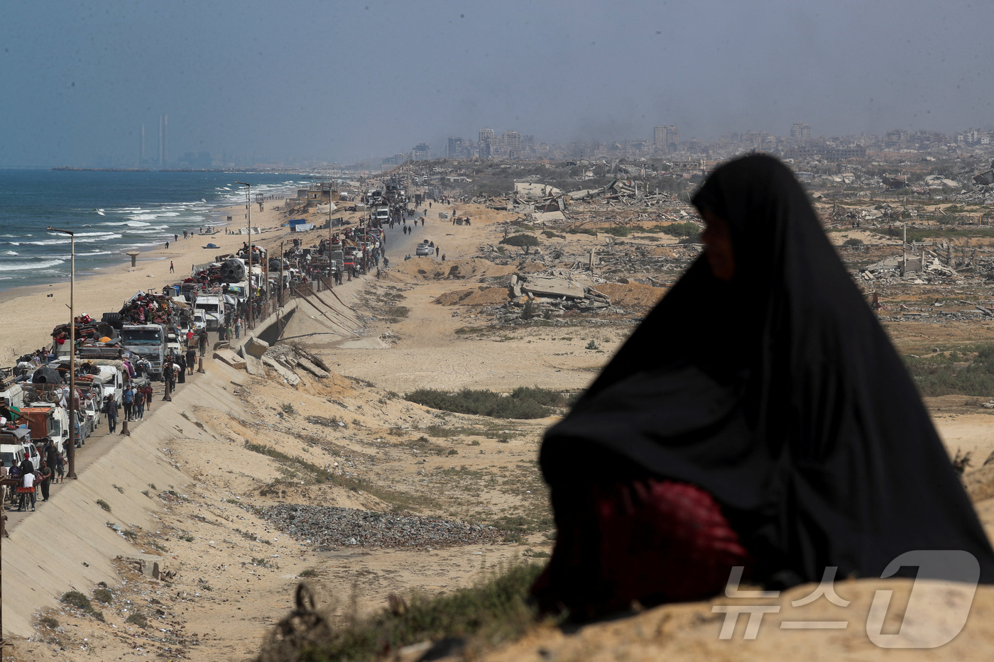 17일(현지시간) 한 여성이 이스라엘의 군사 작전으로 가자지구 북부에서 남쪽으로 이동하는 팔레스타인 피란민들을 바라보고 있다. 2025.09.17. ⓒ 로이터=뉴스1 ⓒ News1 윤다정 기자 |