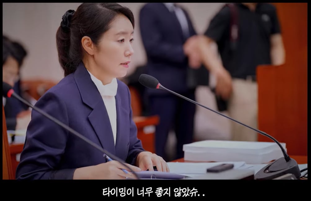 이 바로 다음 장면에는 “받은 지 한참 지나 이대로 둘 수 없슈” “선우: 고민” “보좌진: 고민” “결심했슈” 등의 자막이 달린 장면이 연달아 등장하고, 실버 버튼 실물이 등장했다. ‘받은 지 한참 지나 이대로 둘 수 없단 생각에 강 의원과 보좌진이 고민 끝에 실버 버튼을 공개하기로 했다’는 것으로 해석됐다.