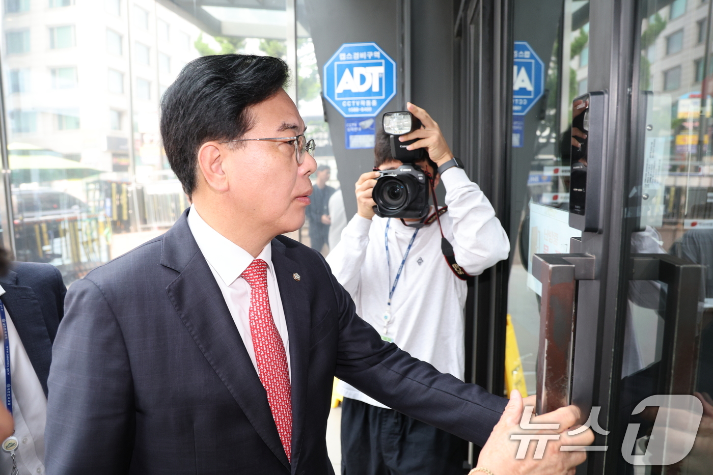 (서울=뉴스1) 신웅수 기자 = 송언석 국민의힘 원내대표가 18일 서울 여의도 중앙당사에서 김건희 특검팀의 국민의힘 당원명부 압수수색 시도에 당사로 들어서고 있다. 2025.9.18/뉴스1