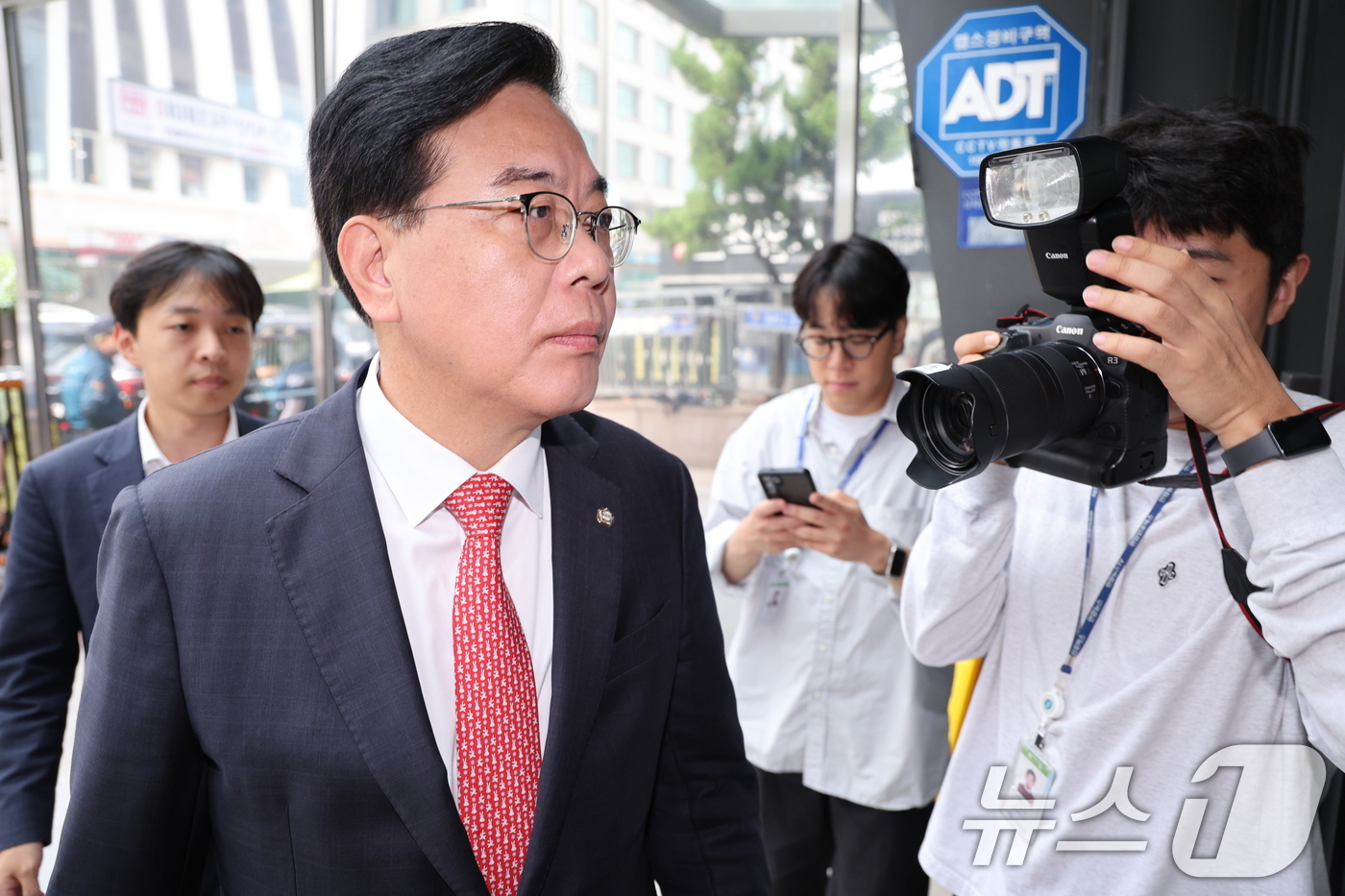 (서울=뉴스1) 신웅수 기자 = 송언석 국민의힘 원내대표가 18일 서울 여의도 중앙당사에서 김건희 특검팀의 국민의힘 당원명부 압수수색 시도에 당사로 들어서고 있다. 2025.9.18/뉴스1