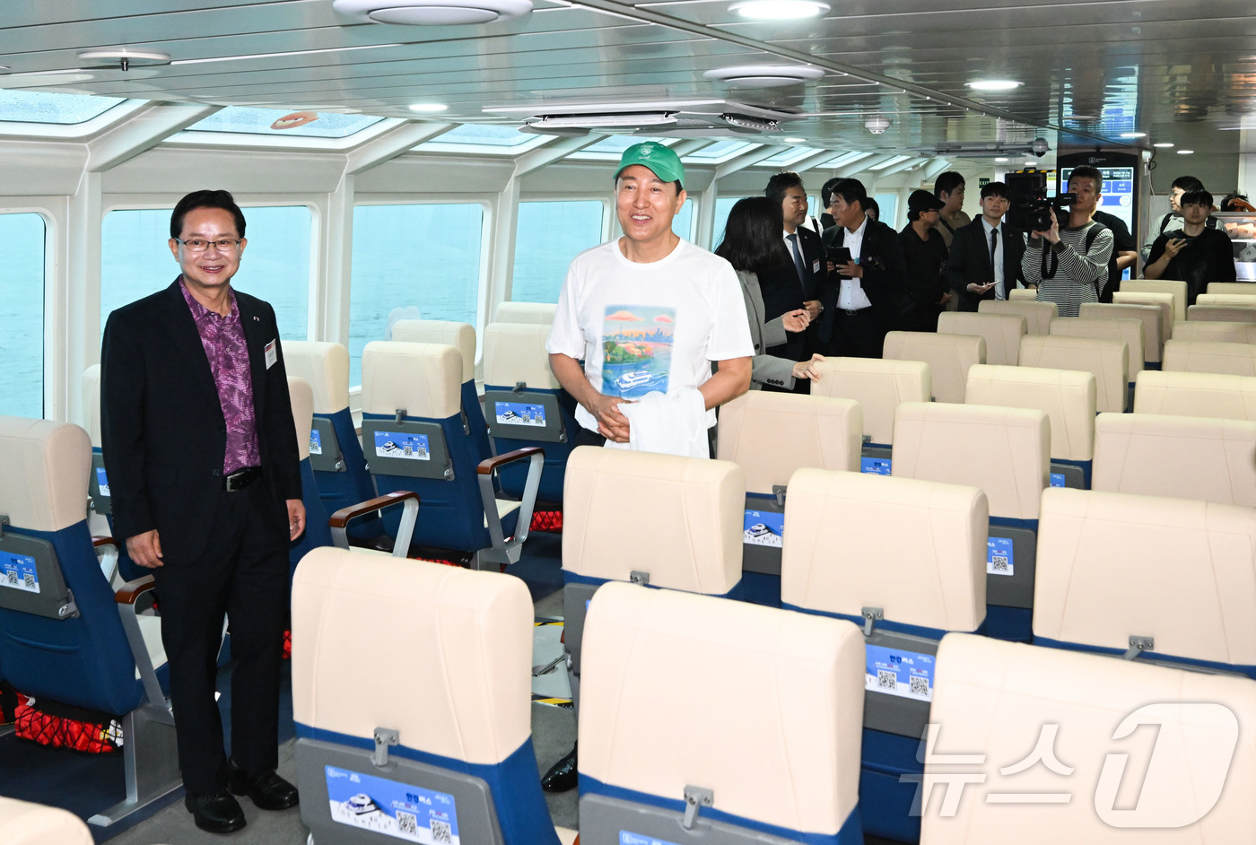 한강버스 정식 운항을 앞두고 취항식이 열린 17일 서울 영등포구 여의도선착장에서 오세훈 서울시장이 한강버스를 살펴보고 있다. 서울의 첫 수상 대중교통 '한강버스'는 18일 오전 11시 첫 출항에 나선다.(공동취재) 2025.9.17/뉴스1 ⓒ News1 박지혜 기자 |