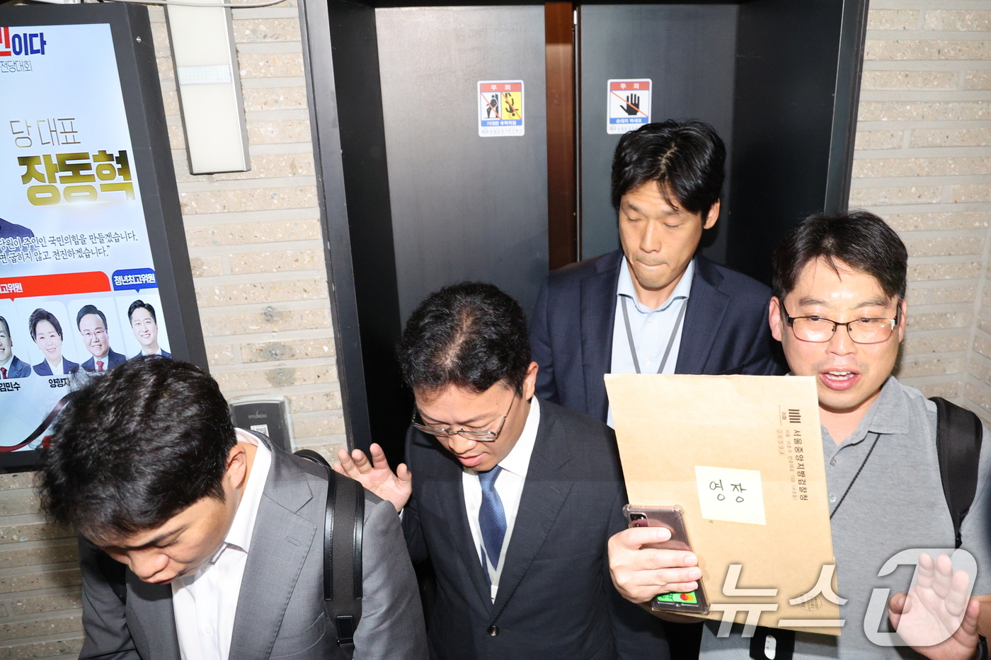 (서울=뉴스1) 신웅수 기자 = 김건희 특검 수사관들이 18일 서울 여의도 중앙당사에서 국민의힘 당원명부 압수수색을 시도하고 있다. 2025.9.18/뉴스1