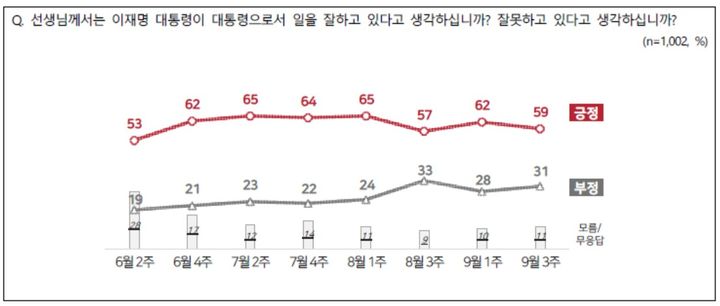 직전 조사(9월1주차)와 비교해 긍정 평가는 3%포인트(p) 내렸고, 부정 평가는 3%p 올랐다.