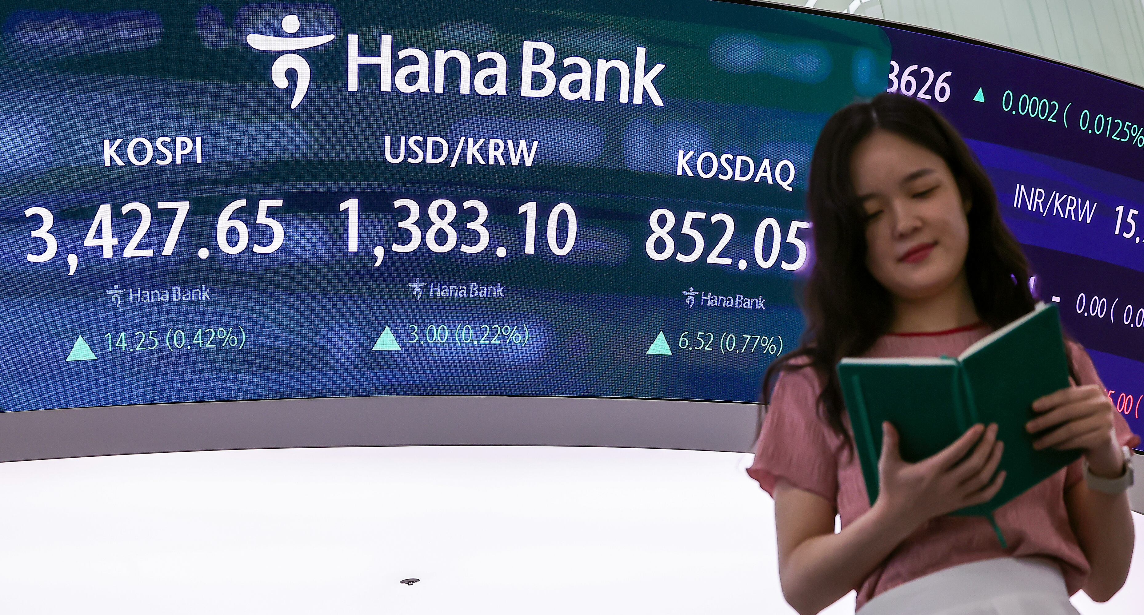 18일 오전 서울 중구 하나은행 딜링룸 전광판에 개장 시황이 나오고 있다. 이날 코스피는 전 거래일보다 14.25포인트(0.42%) 오른 3427.65에 거래되고 있다. 코스닥 지수는 전 거래일보다 6.52포인트(0.77%) 오른 852.05에 거래되고 있다. 서울외환시장에서 달러·원 환율은 전일보다 3.00원 오른 1383.10원에 거래되고 있다. /뉴스1 |