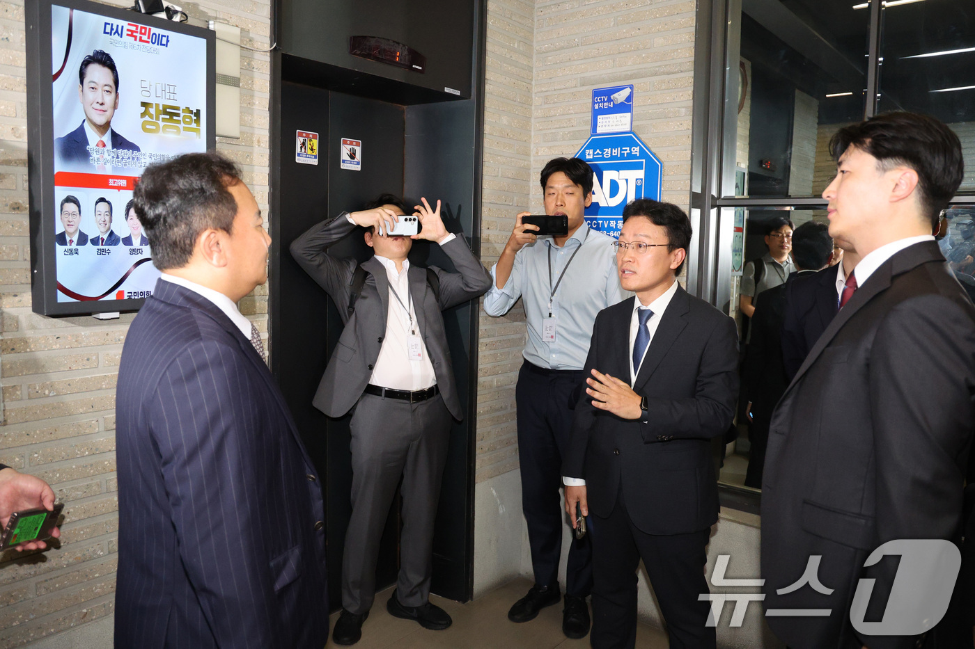 (서울=뉴스1) 신웅수 기자 = 국민의힘 당원명부 압수수색에 나선 김건희특검 수사관들이 18일 서울 여의도 중앙당사에서 국민의힘 관계자와 출입을 두고 언쟁을 벌이고 있다. 2025.9.18/뉴스1