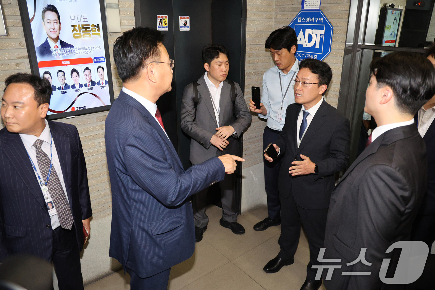 (서울=뉴스1) 신웅수 기자 = 국민의힘 당원명부 압수수색에 나선 김건희특검 수사관들이 18일 서울 여의도 중앙당사에서 유상범 국민의힘 의원과 출입을 두고 언쟁을 벌이고 있다. 2025.9.18/뉴스1