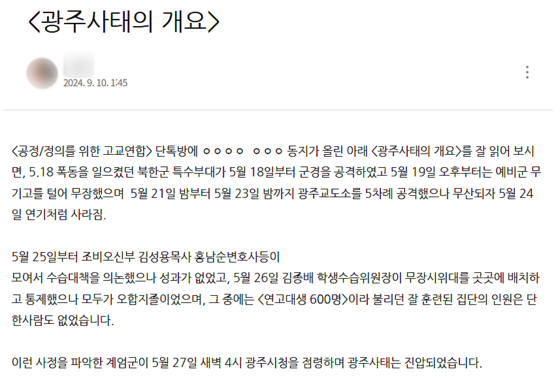 며칠 뒤 다른 글에서는 "5·18은 북괴가 전면 남침의 '마중물' 수단으로 일으켰다"는 허위사실도 퍼뜨렸습니다.