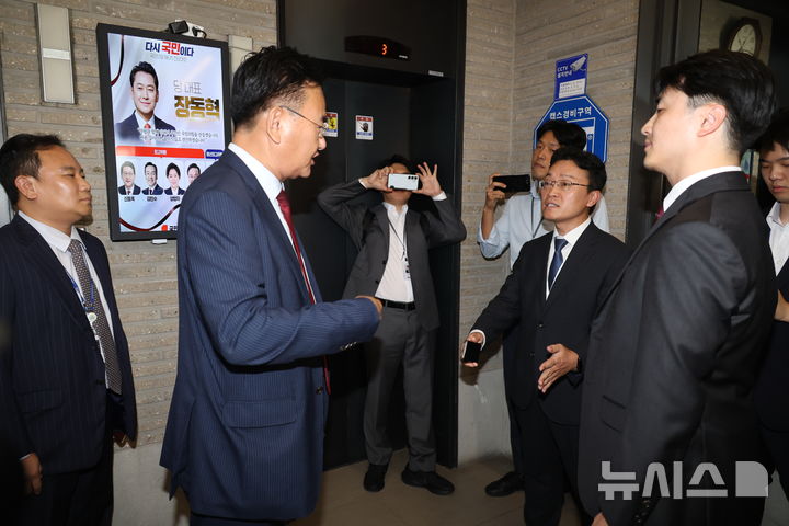 [서울=뉴시스] 조성봉 기자 = 김건희 여사의 의혹들을 수사하는 민중기 특별검사팀이 '통일교 집단 입당' 의혹과 관련해 18일 오전 서울 여의도 국민의힘 중앙당사를 압수수색하기 전 유상범 원내운영수석부대표와 대화를 하고 있다.2025.09.18. suncho21@newsis.com |