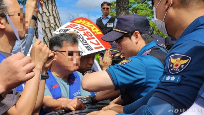 하지만 경찰 50여명은 "'기자회견' 목적이 아닌 단체 행진은 불가하다"며 이들의 행진을 가로막았다. 이 과정에서 노조원들은 "개별적으로 민원을 접수하려는 건데 경찰이 무슨 근거로 막아서느냐", "길을 막지 말라"며 고성이 오갔다. 이런 대치는 30분 넘게 이어졌고, 이후 경찰과 노조 측은 '10명씩 이동하는 것'을 조건으로 10명씩 나눠 민원실로 이동해 차례로 접수했다.