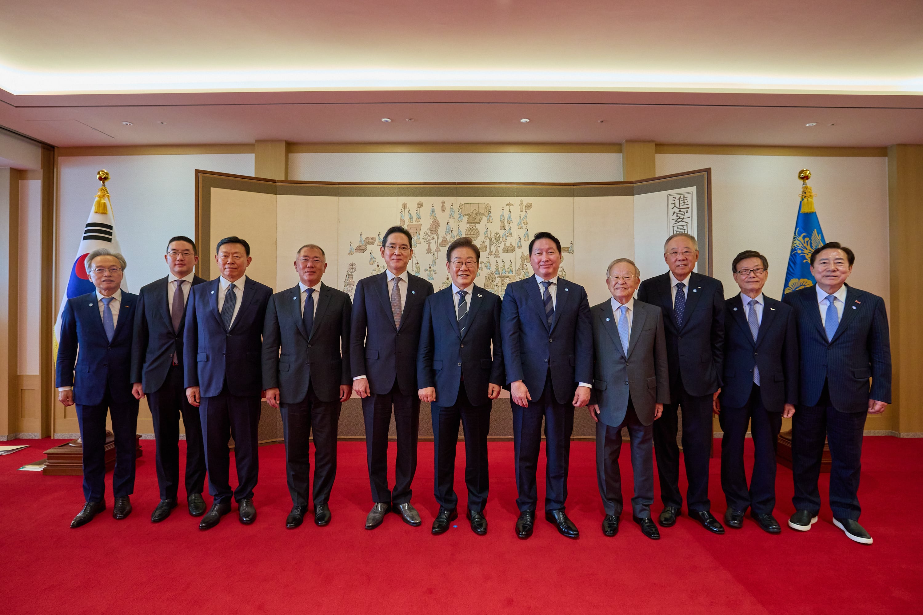 지난 7월 13일 이재명 대통령이 서울 용산구 대통령실에서 열린 6경제단체와 기업인 간담회에서 참석자들과 기념촬영을 하고 있다. 왼쪽부터 최진식 한국중견기업연합회 회장, 구광모 LG그룹 회장, 신동빈 롯데그룹 회장, 정의선 현대차그룹 회장, 이재용 삼성전자 회장, 이 대통령, 최태원 SK그룹 회장 겸 대한상공회의소 회장, 손경식 한국경영자총협회 회장, 류진 한국경제인협회 회장, 윤진식 한국무역협회 회장, 김기문 중소기업중앙회 회장./대통령실 제공 |