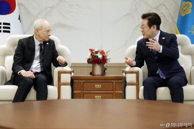 이재명 대통령이 18일 세계적 석학인 마이클 샌델 하버드대 교수와 만나 "교수님 같은 분들이 평화가, 정치가 현실적 이익일 수 있다고 말씀 주신다면 (사람들에게) 큰 영향을 미칠 것"이라고 밝혔다. 샌델 교수는 저서 '정의란 무엇인가' '공정하다는 착각' 등으로 국내에서도 유명하다. 이날 샌델 교수는 통일부가 주최하는 '2025 국제 한반도 포럼' 기조연설을 위해 방한했다.