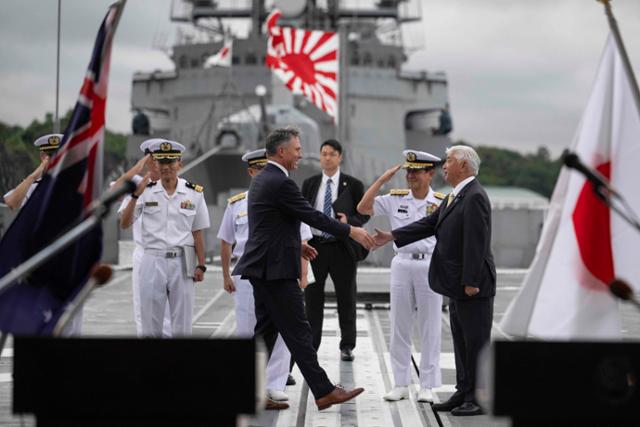 나카타니 겐(앞줄 오른쪽) 일본 방위장관과 리처드 말레스(왼쪽) 호주 국방장관이 5일 일본 가나가와현 요코스카시 해상자위대 기지에 정박한 호위함에 탑승해 인사하고 있다. 요코스카=AP 연합뉴스 |
