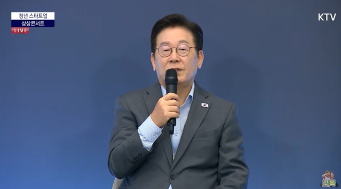 이재명 대통령이 17일 오후 경기도 성남시 판교 스타트업스퀘어에서 '청년 스타트업 상상콘서트'를 열고 청년창업인들을 만나 격려의 말을 전하고 있다. [사진=KTV] |