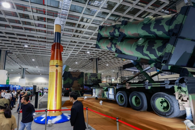 대만 타이베이에서 열린 국제항공우주·방산전시회(TADTE 2025)에서 공개된 신형 치앙궁 요격미사일(왼쪽)과 이동식 발사대. 이번 전시회에는 미국·프랑스·독일 등 14개국 400여 개 업체가 참가했다. 2025.9.18 EPA 연합뉴스 |