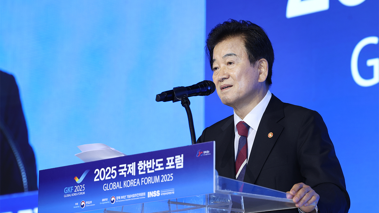 ▲ 18일 서울 종로구 포시즌스호텔에서 '한반도와 동북아의 평화 공존으로의 전환'을 주제로 열린 2025 국제한반도포럼(GKF)에서 정동영 통일부 장관이 개회사를 하고 있다.