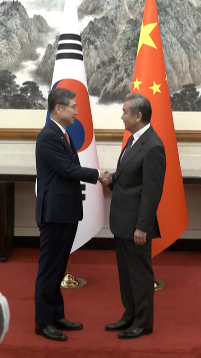 조현 외교부 장관이 17일(현지시간) 오후 베이징 댜오위타이에서 열린 한·중 외교장관회담에서 왕이 중국공산당 외사판공실 주임 겸 외교부장과 악수를 하고 있다. 외교부 |