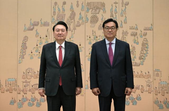 윤석열 전 대통령이 지난해 4월 24일 용산 대통령실 청사에서 정진석(오른쪽) 비서실장에게 임명장을 수여한 후 기념촬영을 하고 있다. 서재훈 기자 |