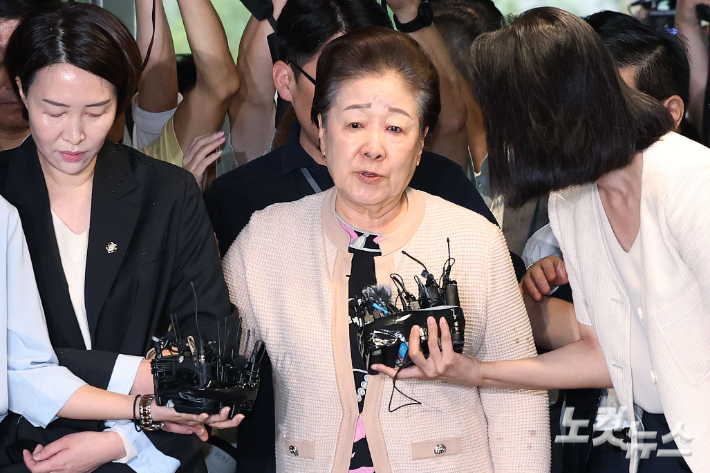 불법 정치 자금 제공 혐의를 받는 한학자 통일교 총재가 17일 오전 서울 종로구 김건희 특검팀(특별검사 민중기) 사무실에 출석하고 있다. 류영주 기자 |