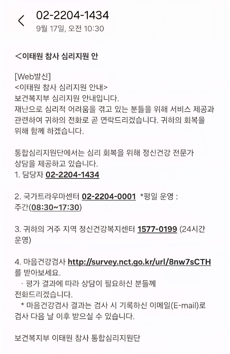 보건복지부가 운영하는 ‘이태원 참사 통합심리지원단’이 지난 17일 오전 이태원 참사 유족에게 보낸 문자메시지. 10·29 이태원참사 유가족협의회 제공 |