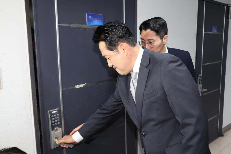 장동혁 국민의힘 대표가 18일 서울 여의도의 한 오피스텔에 위치한 당원명부 데이터베이스(DB) 관리업체로 들어가고 있다. 연합뉴스 |