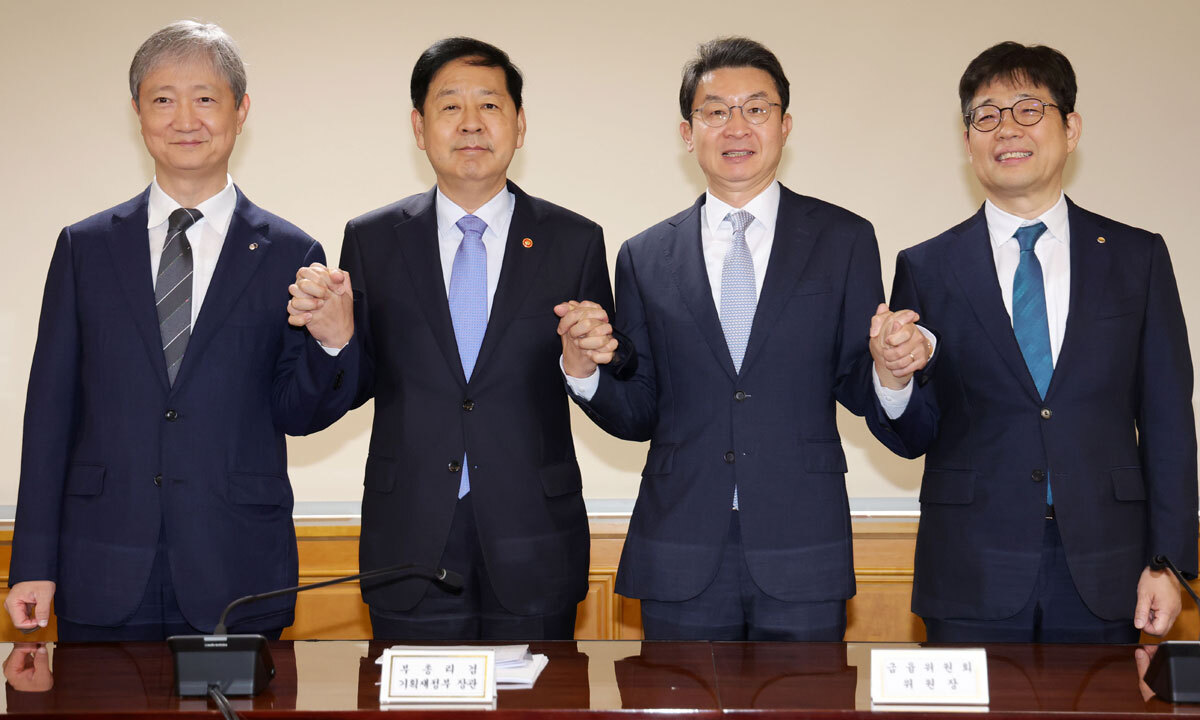 18일 서울 중구 은행회관에서 열린 확대 거시경제금융회의에서 이찬진 금융감독원장(왼쪽부터), 구윤철 경제부총리 겸 기획재정부 장관, 이억원 금융위원장, 유상대 한국은행 부총재가 미 연준의 금리 인하 결정에 따른 금융시장 동향을 점검한 뒤 기념촬영하고 있다. 뉴시스 |