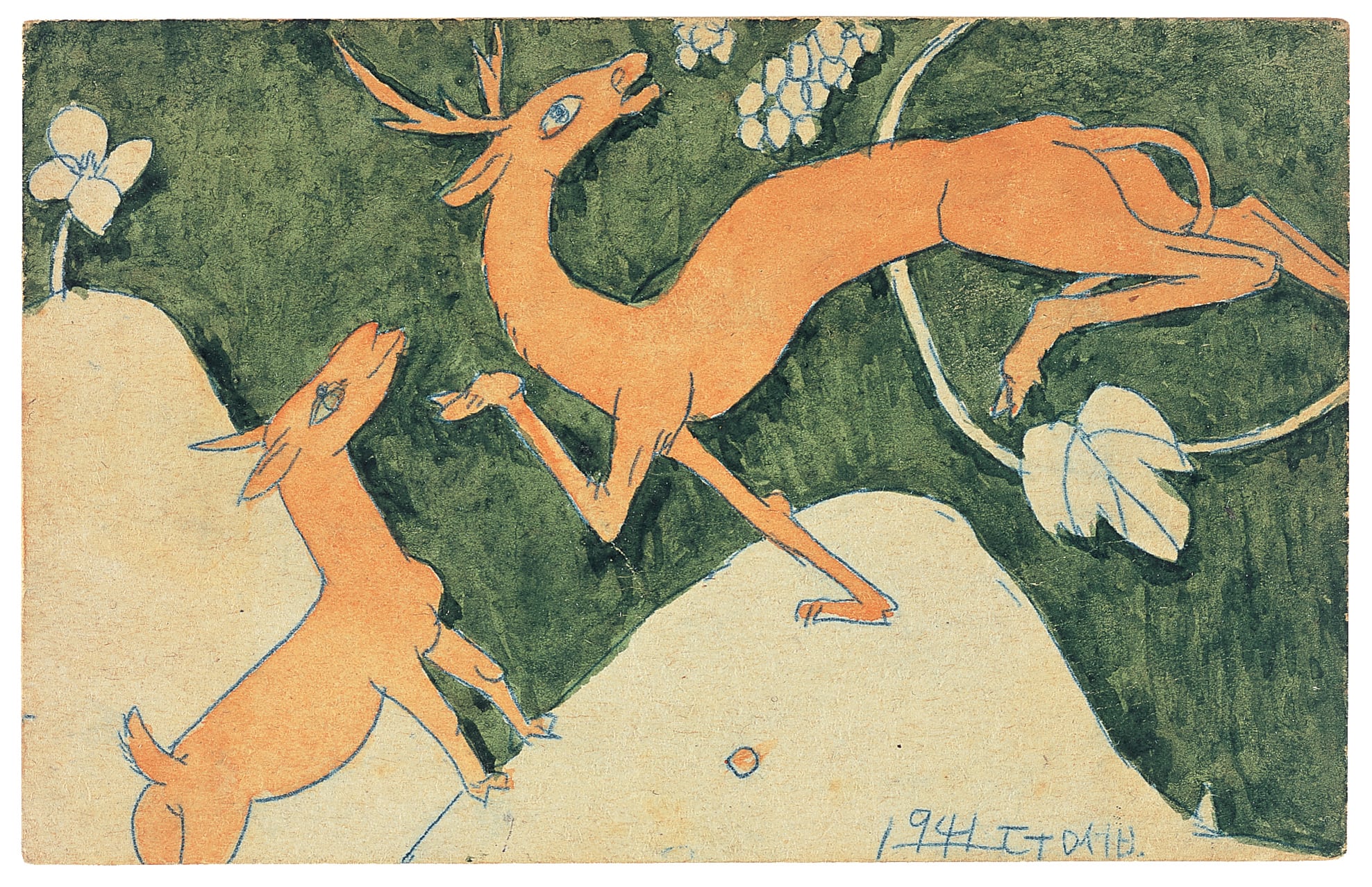 이중섭, ‘포도밭의 사슴’. 14×9cm. 엽서에 먹지, 채색. 1941년 4월 24일 연인 마사코에게 보낸 엽서화다. /개인 소장 |