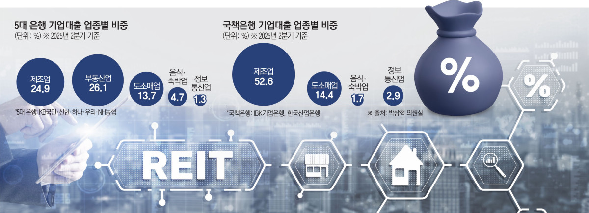국책은행도 상황은 크게 다르지 않다. IBK기업은행과 한국산업은행의 기업대출 합계는 올해 2분기 약 310조 원이다. 이 가운데 제조업이 163조 원으로 전체의 52.6%를 차지했으며 도소매업은 44조 원(14.4%) 수준이었다. 정보통신업은 9조 원(2.9%), 음식·숙박업은 5조 원(1.7%)에 불과했다. 정책금융도 첨단산업과 대기업 협력업체 중심으로 흘러 소상공인·자영업자는 지원의 공백에 놓여 있다는 평가다.