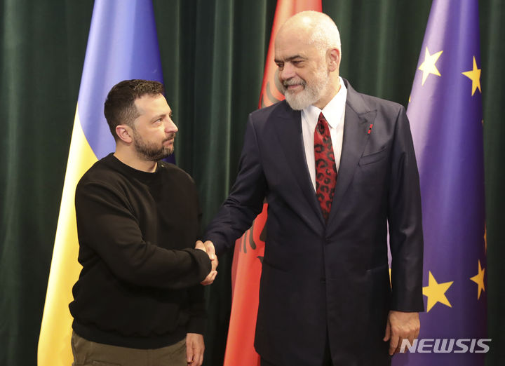 [티라나=AP/뉴시스] 알바니아를 방문한 볼로디미르 젤렌스키(왼쪽) 우크라이나 대통령이 2024년 2월 28일 수도 티라나에서 에디 라마 알바니아 총리와 회담 전 악수하고 있다. 유럽연합 가입을 앞둔 알바니아는 우크라이나 전쟁에 초점을 둔 평화, 안보, 협력에 관한 동남유럽 국가 정상회담을 개최해왔다. 2025.09.19. |