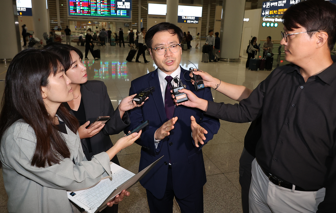 여한구 산업통상자원부 통상교섭본부장이 19일 오전 인천국제공항 제2여객터미널을 통해 귀국하며 취재진 질문에 답하고 있다. [연합] |