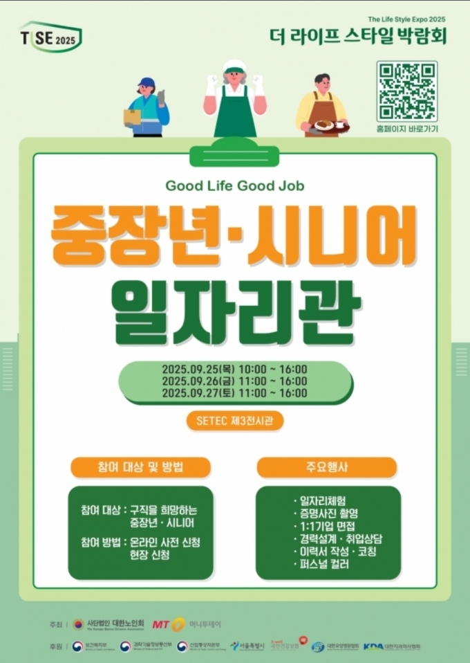 한편 코웨이와 hy, 한국맥도날드 등 기업들은 오는 25일(목)부터 27일(토)까지 서울 강남구 대치동 세텍(SETEC)에서 열리는 '더 라이프 스타일 박람회 2025' 제3전시장에서 중장년·시니어 채용을 진행한다. 이번 박람회는 다양한 채용 기회와 지원 프로그램을 통해 구직자들의 취업 가능성을 높일 예정이다.