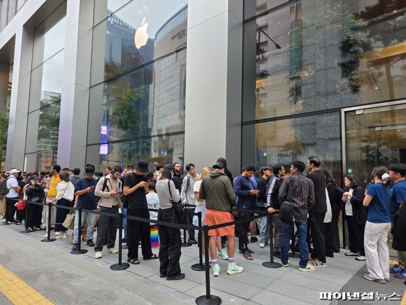 19일 오전 서울 중구 애플스토어 명동 앞에 아이폰 17 시리즈 구매를 기다리는 인파가 몰렸다. 사진=박성현 기자 |
