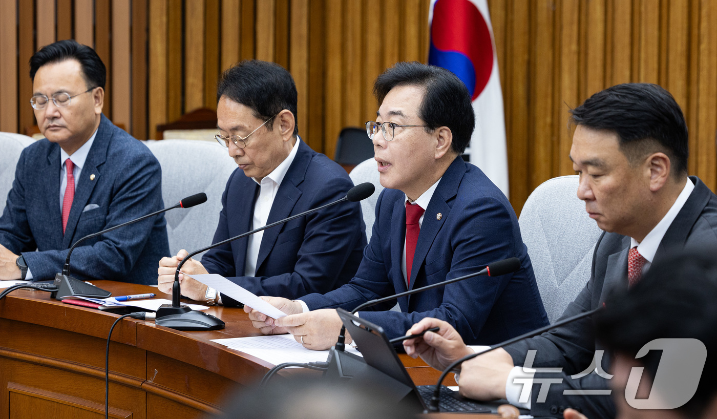 송언석 국민의힘 원내대표가 19일 서울 여의도 국회에서 열린 원내대책회의에서 모두 발언을 하고 있다. 2025.9.19/뉴스1 ⓒ News1 유승관 기자 |