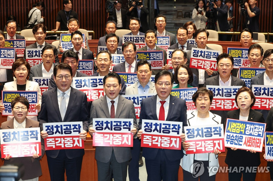 국민의힘 장동혁 대표와 송언석 원내대표 등 의원들이 19일 국회에서 열린 의원총회에서 사법장악 중단을 촉구하는 구호를 외치고 있다. 〈사진=연합뉴스〉 |