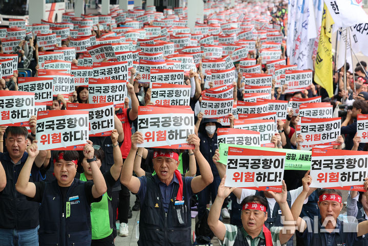 [서울=뉴시스] 류현주 기자 = 인천과 김포 등 전국 15개 공항 노동자들이 19일 총파업에 돌입했다.