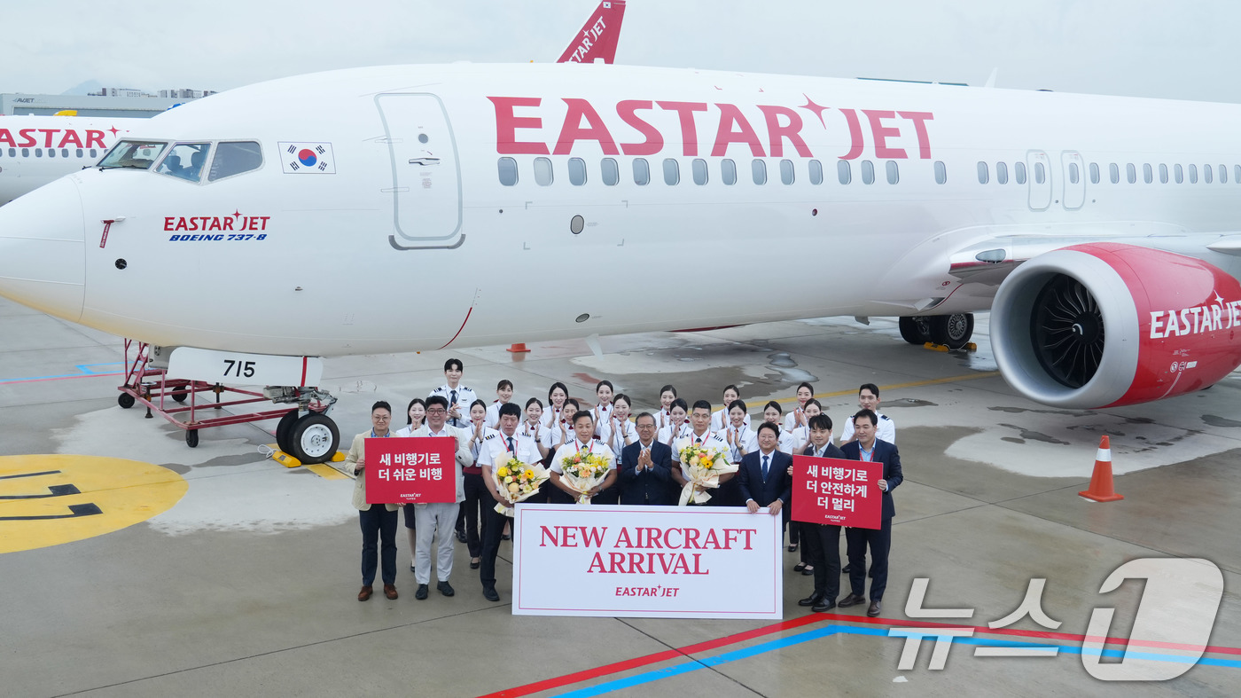 (서울=뉴스1) 박지혜 기자 = 19일 오후 김포국제공항에서 조중석 이스타항공 대표(앞줄 가운데)와 운항 승무원, 객실 승무원이 새로 도입된 항공기 앞에서 기념 촬영을 하고 있다. 이스타항공은 지난 16일에는 16, 17호기를 동시에 도입했으며, 10월에는 19호기, 12월에는 20호기를 도입해 연말까지 총 20대의 항공기를 운영하게 된다. 올해 도입되는 다섯 대의 기재(16~20호기)는 189석 규모의 B737-8 신기종으로, 모두 중고기가 아닌 제작 후 항공사에 처음 인도되는 신규 항공기다. 20호기까지 도입되면 이스타항공은 보유 기재 중 신기종 B737-8이 차지하는 비중이 50%까지 확대되며 항공기 평균 기령(항공기 나이)이 약 7년대로 낮아진다. (이스타항공 제공. 재판매 및 DB 금지) 2025.9.19/뉴스1