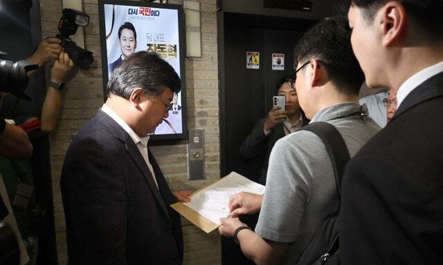 18일 서울 여의도 국민의힘 중앙당사 현관 엘리베이터 앞에서 김건희 특검팀이 제시한 압수수색 영장을 국민의힘쪽 변호사가 읽고 있다. 윤운식 선임기자 yws@hani.co.kr |