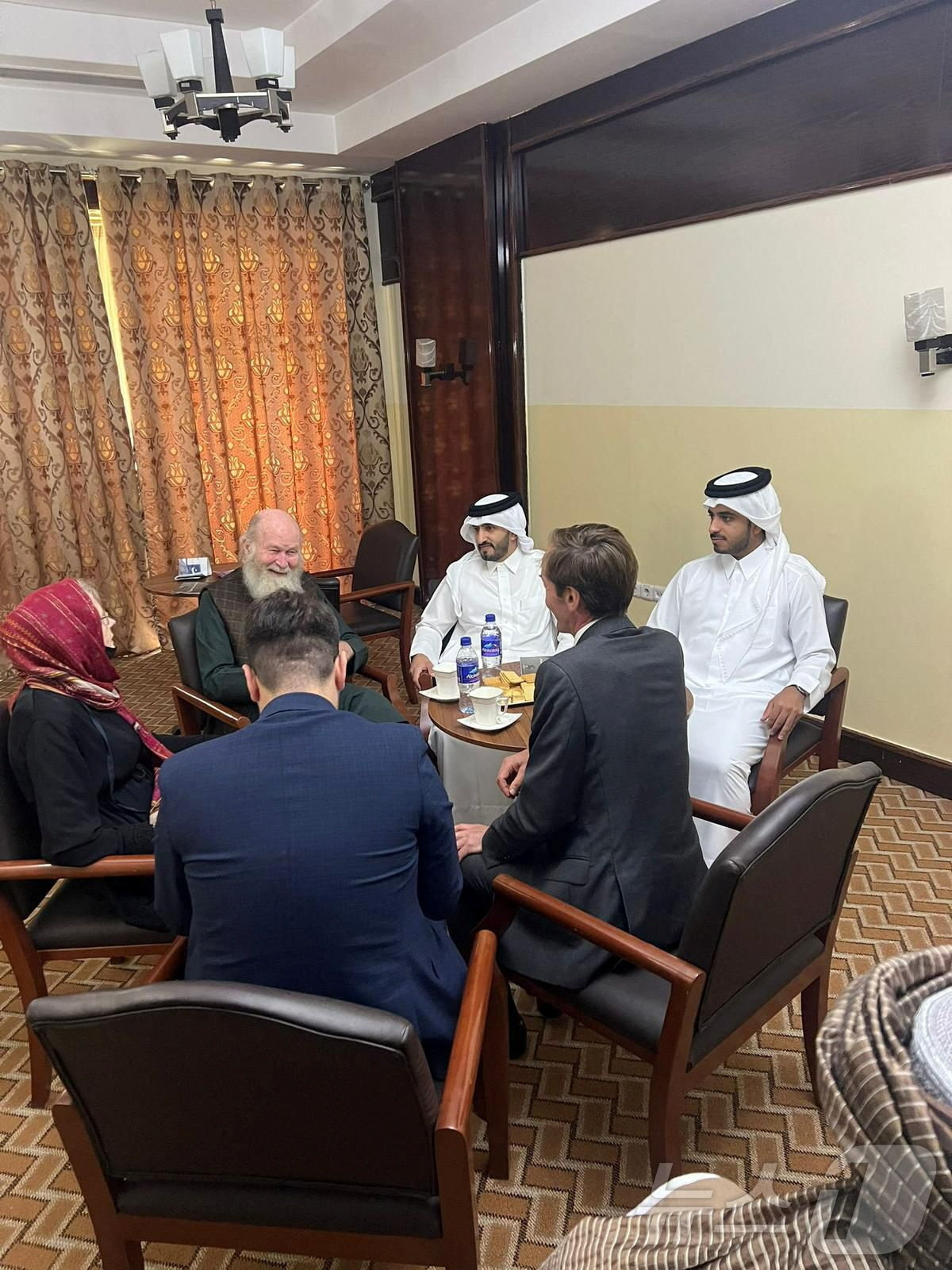 19일(현지시간) 영국 국적의 바비 레이놀즈(76)와 피터 레이놀즈(80) 부부가 아프가니스탄 카불에서 영국과 카타르 외교관들과 대화를 나누고 있다. 레이놀즈 부부는 지난 2월 탈레반 정권에 의해 구금됐다. 사진은 카타르 정부 제공. 2025.09.19 ⓒ 로이터=뉴스1 ⓒ News1 김지완 기자 |
