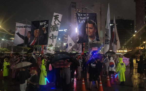 최근 피살된 미국 우익 활동가 찰리 커크 사진과 함께 “우리가 찰리 커크다”(We are Charlie Kirk)라고 적힌 깃발도 보였다.