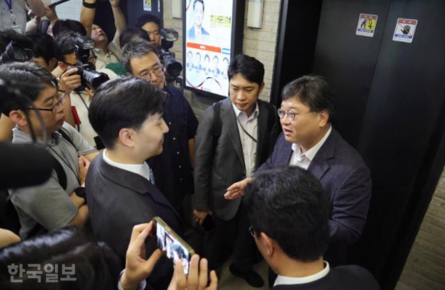 국민의힘 당원명부 압수수색에 나선 민중기 특별검사팀 관계자들이 18일 서울 여의도 중앙당사에서 국민의힘 측 변호사(오른쪽)와 당사 진입을 두고 대화하고 있다. 수사팀은 당사에서 철수하고 명부 데이터베이스(DB) 관리업체를 압수수색했다. 고영권 기자 |