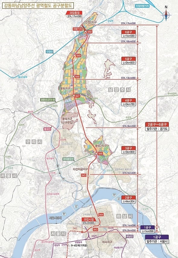 강동하남남양주선은 지하철 9호선 연장 노선으로, 서울 강동구에서 경기 하남 미사지구, 남양주 왕숙, 진접2지구로 이어지는 총연장 17.59㎞ 노선이다. 8정거장이 들어설 예정이고 총사업비는 2조8200억원 규모다. 경기도와 함께 서울시·한국토지주택공사(LH)·경기주택도시공사(GH) 등이 사업비를 분담한다. 1공구는 서울시, 2~6공구는 경기도 소관이다.