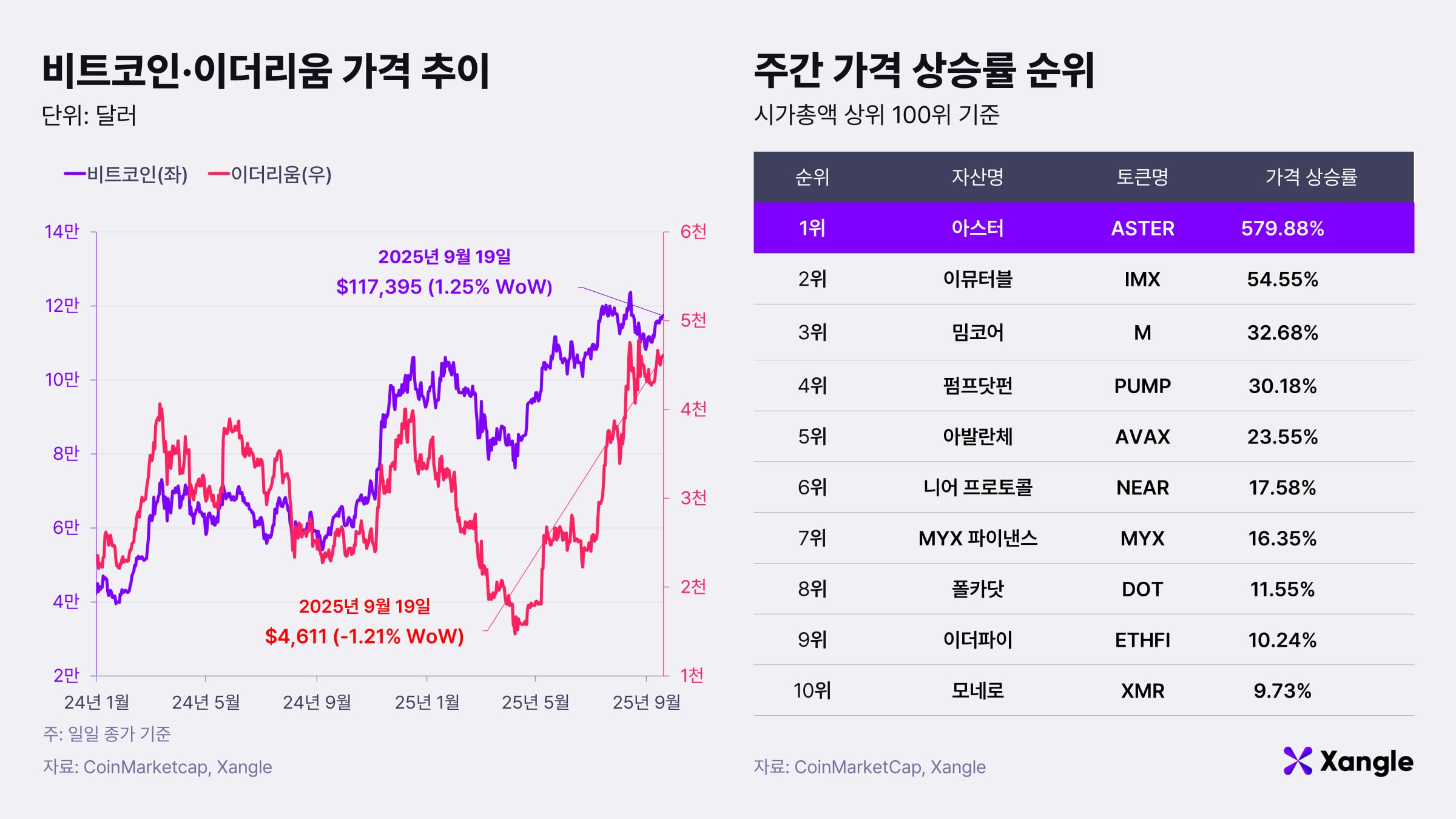 9월 15~19일 가상자산 시장은 연준의 금리 인하 결정과 미·중 관세 휴전 기대로 소폭 반등했다. 19일 비트코인은 전주 대비 1.25% 상승한 11만7395달러, 이더리움은 1.21% 하락한 4611달러를 기록했다. 알트코인 시장에서는 아스터(ASTER, +579.88%), 이뮤터블(IMX, +54.55%), 밈코어(M, +32.68%) 등이 강세를 보였다.
