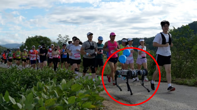 사람들과 함께 마라톤을 뛰고 있는 사족보행 로봇 '라이보2' /사진제공=라이온로보틱스 |
