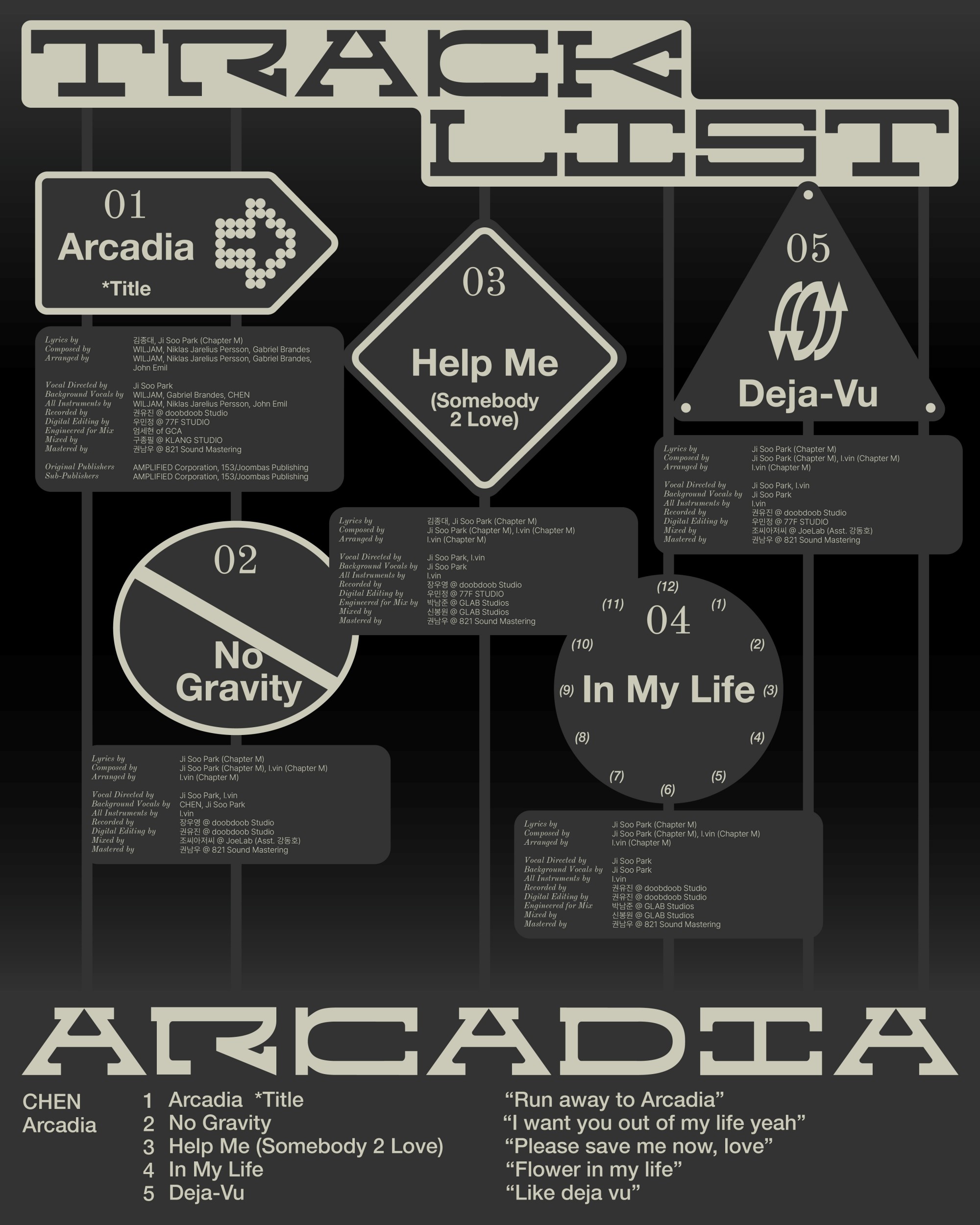 첸은 '아카디아'와 '헬프 미 썸바디 투 러브' 작사 크레딧에 이름을 올렸다. 트랙 이미지 하단에는 가사 일부를 공유했다.