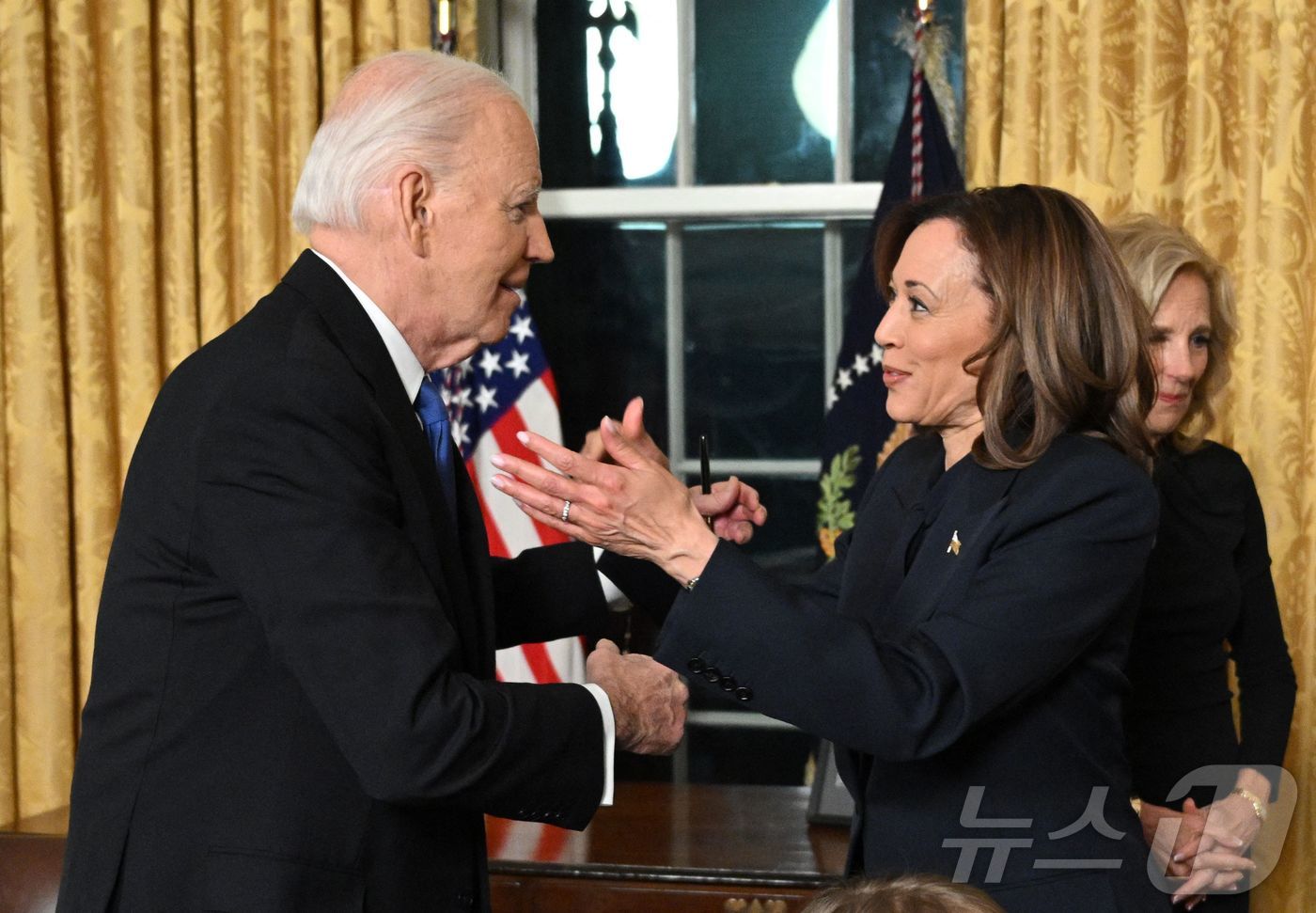 조 바이든 전 미국 대통령이 지난 1월 15일(현지시간) 워싱턴 백악관에서 대통령 퇴임 5일을 앞둔 고별 연설을 마친 뒤 카멀라 해리스 부통령과 포옹을 하고 있다. 2025.01.16 ⓒ AFP=뉴스1 ⓒ News1 우동명 기자 |
