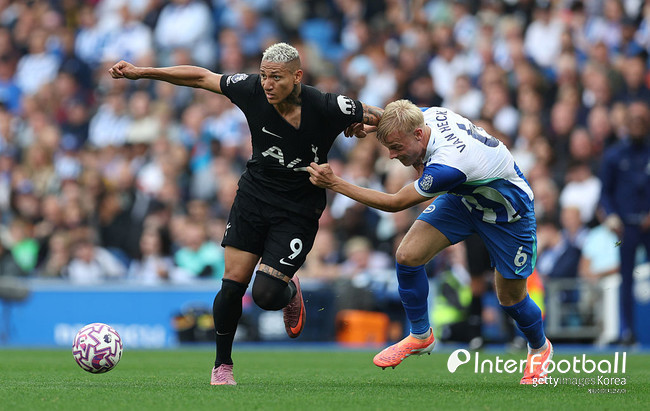 토트넘도 반격했다. 전반 24분 포로가 때려준 롱패스를 히샬리송이 받았는데 왼발 슈팅이 옆그물을 때렸다. 전반 27분 오도베르의 발리 슈팅도 골대 옆으로 빗나갔다.
