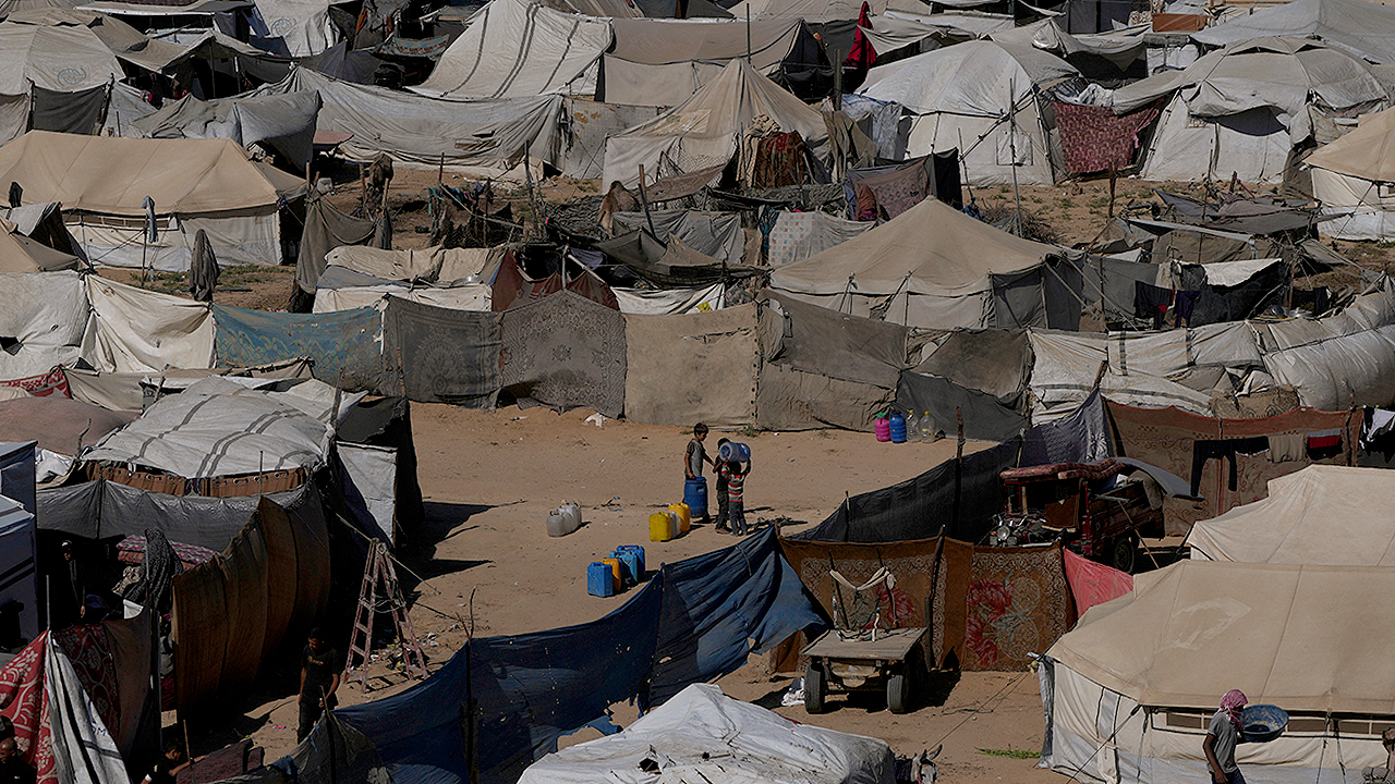 ▲ 현지시간 20일 가자지구에 설치된 임시텐트 캠프에 이스라엘 작전 중 피난민이 된 팔레스타인들이 서 있다.
