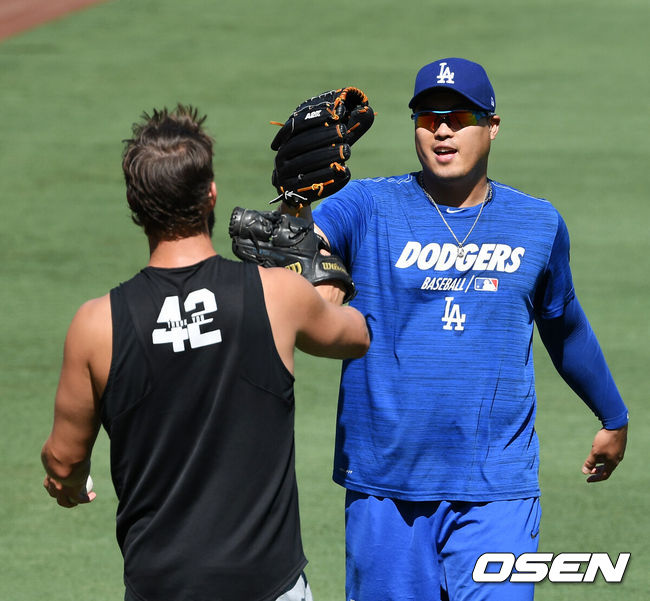 [OSEN=지형준 기자] LA 다저스 류현진(오른쪽)이 클레이튼 커쇼와 캐치볼을 마치고 글러브를 맞대고 있다. /jpnews@osen.co.kr |